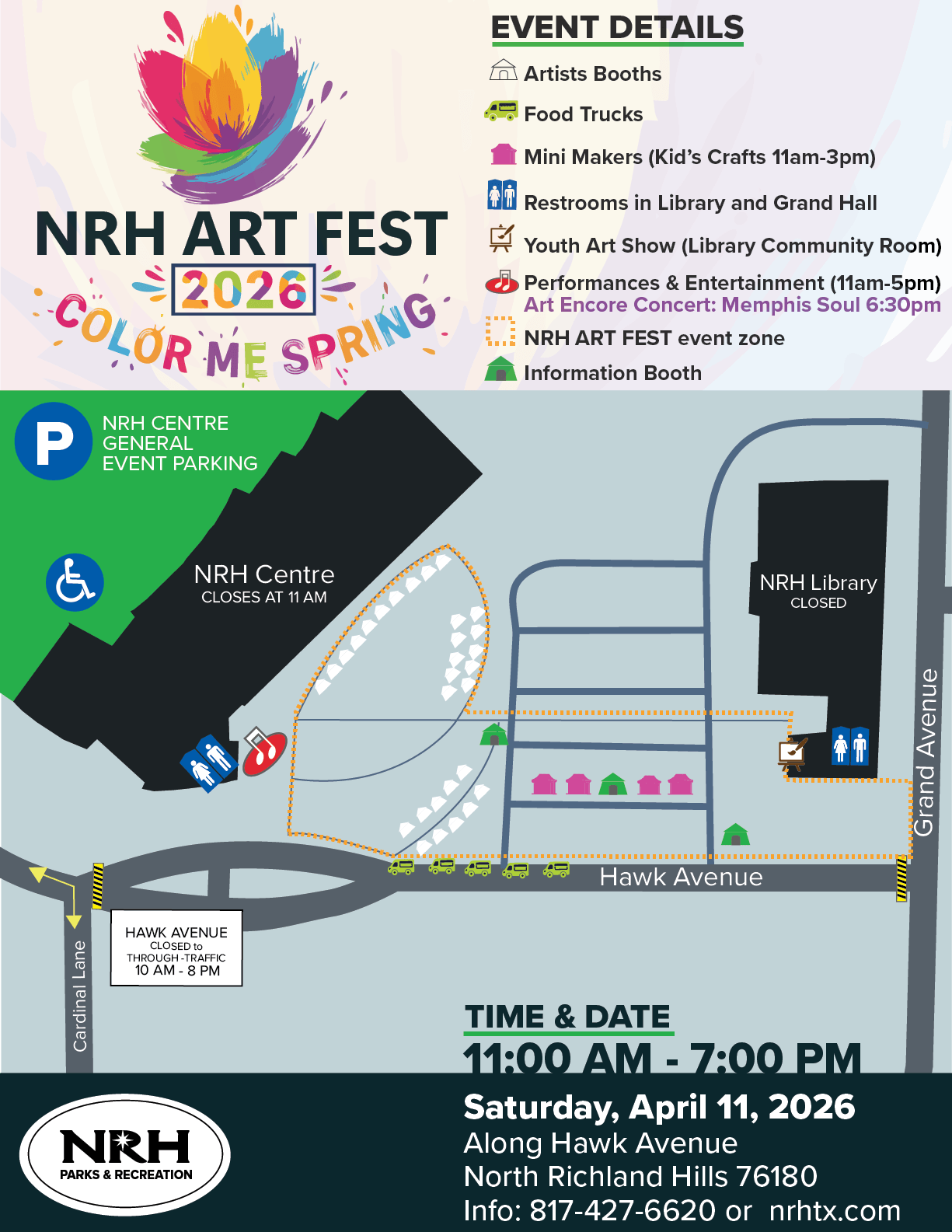 After a variety of live entertainment performances throughout the day, Memphis Soul will take the stage for a special 90-minute concert beginning at 6:30 PM. Bring your lawn chairs or blankets for seating on the lawn at the NRH Centre Plaza.